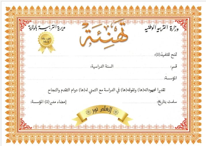 شهادة البكالوريا والتعليم المتوسط والتعليم الابتدائي للجزائر نماذج لشهادات تهنئة وتشجيع فارغة Word لتكريم التلاميذ